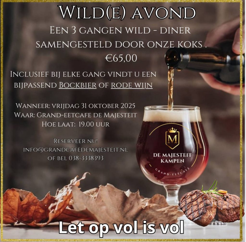 Een 3 gangen wild – diner samengesteld door onze koks. Inclusief bij elke gang vindt u een bijpassend bockbier of rode wijn.