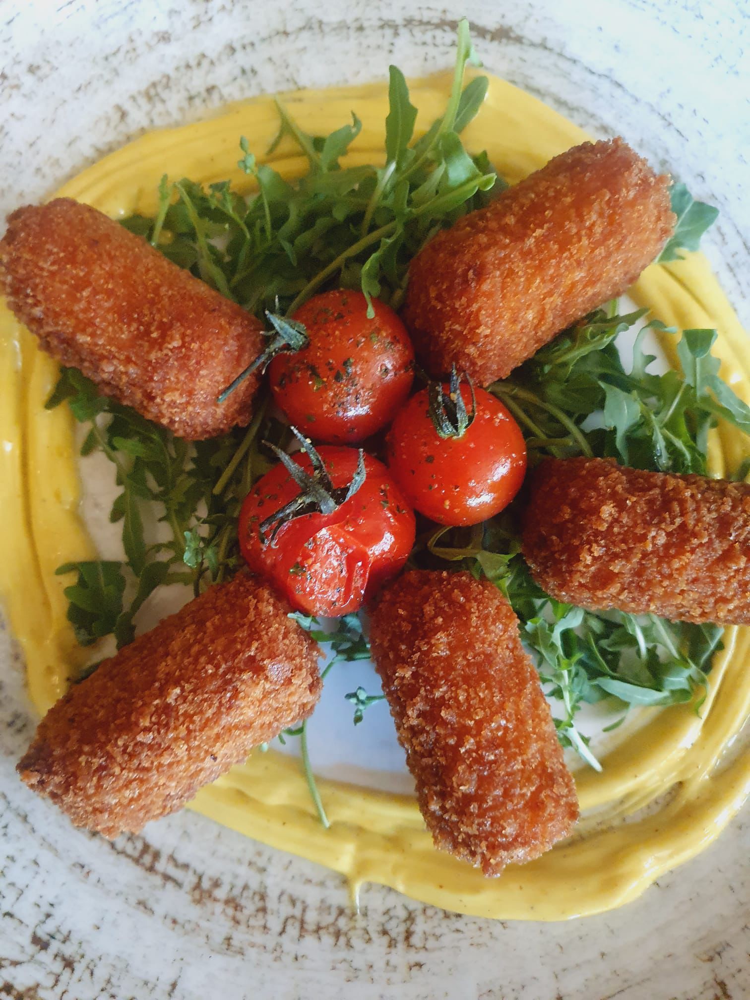In knoflook roomsaus, gegratineerd met kaas, geserveerd met brood