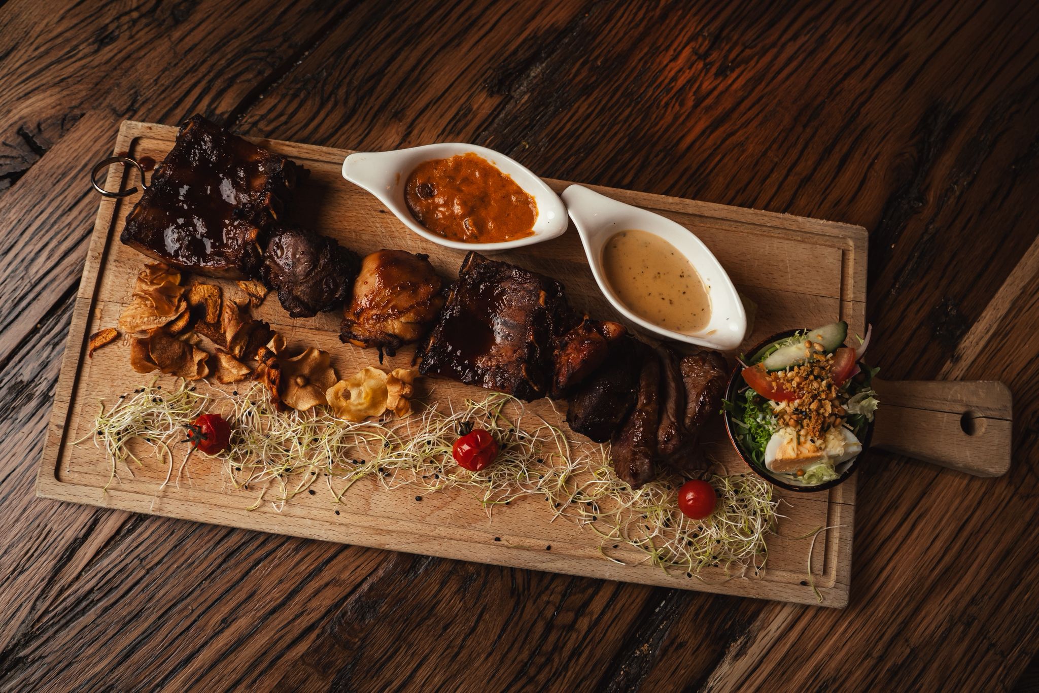 Een spies vol met diverse soorten vlees & 2 sauzen