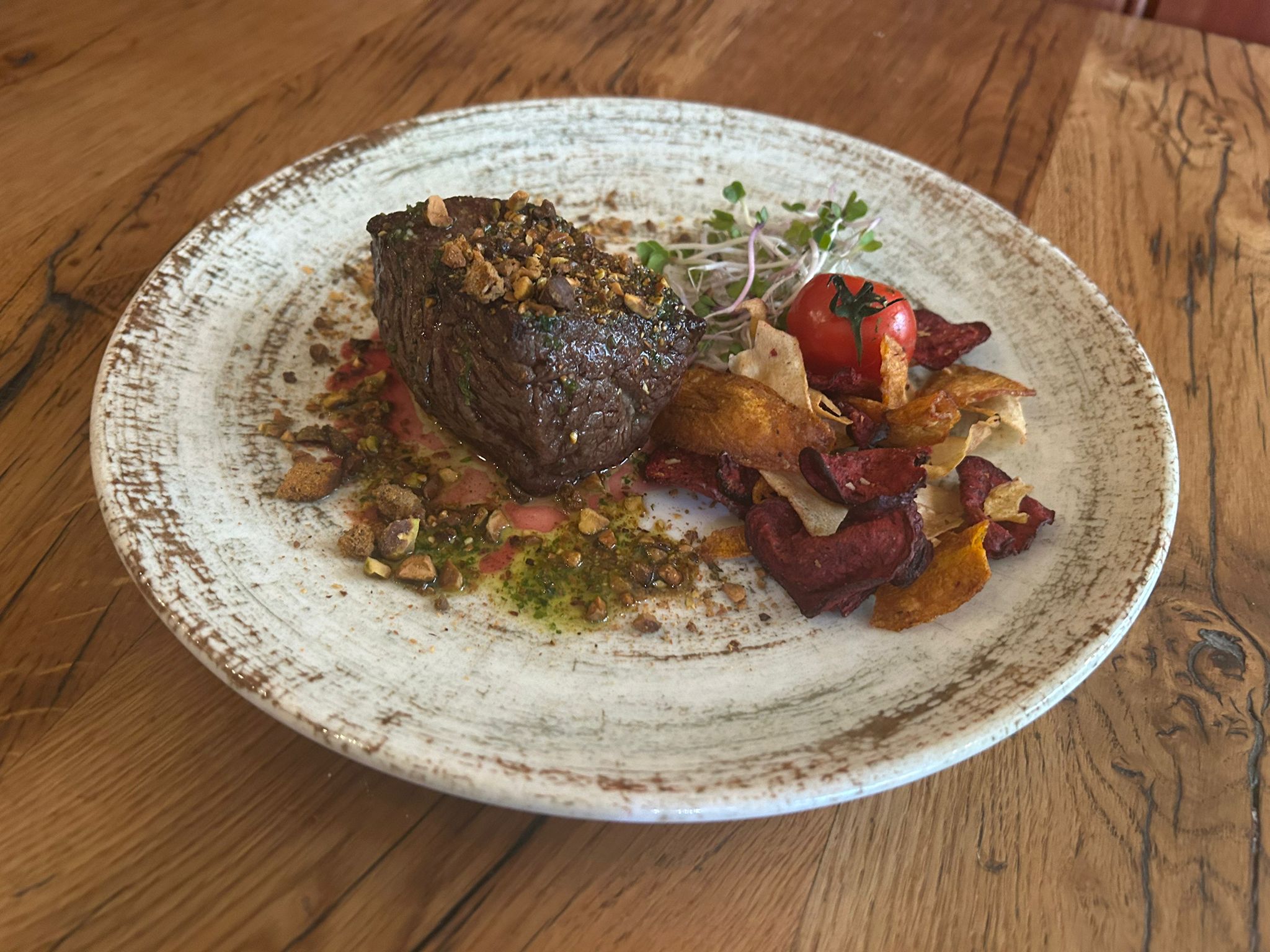 Met een gekruide pistachecrumble en een peterselie-knoflookolie